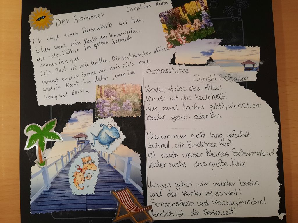 Als erster Schritt war bereits eine Vorauswahl an kurzen Gedichten unterschiedlicher Autoren getroffen worden; das Thema lautete „Jahreszeiten“. Da die Klasse aus 24 Kindern besteht, waren exakt je zwei Gedichte für einen Monat gedacht. Jeder aus der Klasse durfte sich ein Gedicht aussuchen, das er dann sauber auf ein DinA5-Blatt abschrieb; beim Übertragen waren also Genauigkeit gefragt! Denn im Anschluss wurden die handschriftlichen Beiträge aller Schüler/-innen eingesammelt und vervielfältigt, sodass dadurch jede/r in der Klasse die Gedichte der Mitschüler/-innen als Kopie erhalten konnte.