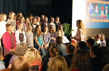 So kam ein abwechslungsreicher, vielfältiger Melodienreigen zustande, der das Publikum durch die Welt des Musicals und der Filmmusik führte. Viele fanden sich plötzlich wieder in die eigene Jugend versetzt, als gleich am Anfang Lieder aus dem Musical „Hair“ gesungen wurden. ABBA-Lieder, schwungvoll gesungen vom Unterstufenchor, brachten Stimmung in die Aula und standen in einem wirkungsvollen Spannungsverhältnis zu eher ruhigeren Melodie wie „Tonight“ aus der „Westside Story“, „Angel of music“ aus dem Phantom der Oper oder „Memory“ aus „Cats“.