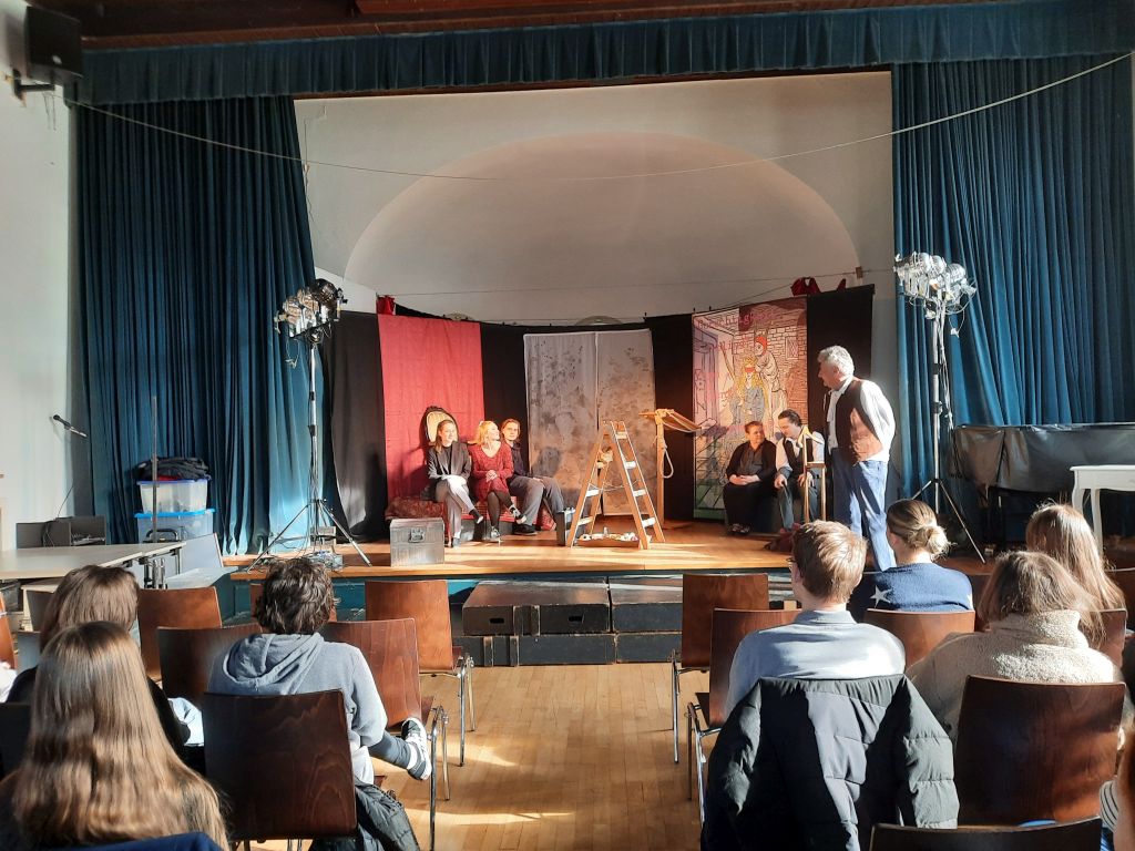Äußerst gewinnbringend für alle Anwesenden gestaltete sich im Anschluss an die Aufführung auch das Theatergespräch mit allem Akteuren, die in einem lockeren Austausch allen Fragen von Schülerseite Rede und Antwort standen. Ganz herzlichen Dank an das Ensemble auch hierfür!