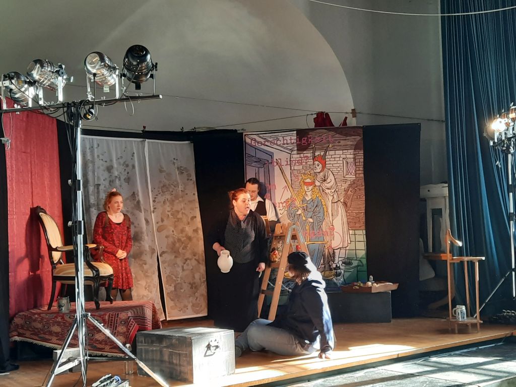 Rund ums Zwischenzeugnis gastierte die Neue Werkbühne München am RWG, um für die Schüler/-innen der Oberstufe Heinrich von Kleists Werk „Der zerbrochne Krug“ aufzuführen. Das Stück, das als einaktiges Lustspiel bzw. dramatische Justizkomödie bezeichnet werden könnte, stellt dabei richterliche Korruption bzw. Willkür in einem fiktiven niederländischen Dorf in den Mittelpunkt. Dass das für den Titel verantwortliche, zu Bruch gegangene Erbstück – der Krug – der Familie lediglich symbolische Bedeutung besitzt, wird hierbei dem Publikum schnell klar: Dorfrichter Adam verkörpert in seiner Rolle eine fragwürdige Figur, welche die eigene Autorität für Erpressung, Intrigen und Machtmissbrauch benutzt – um am Ende des sich u.a. in Rückblicken entwickelnden Handlungsgeschehens selbst an den eigenen Verstrickungen zu scheitern.