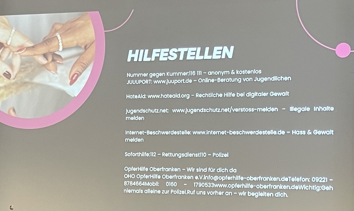 Der Präventionstag machte deutlich, wie wichtig ein bewusster und verantwortungsvoller Umgang mit sozialen Medien ist. Für unsere Schülerinnen und Schüler bot der Vormittag wertvolle Impulse, um digitale Zivilcourage zu stärken und sich aktiv gegen Cybermobbing einzusetzen.