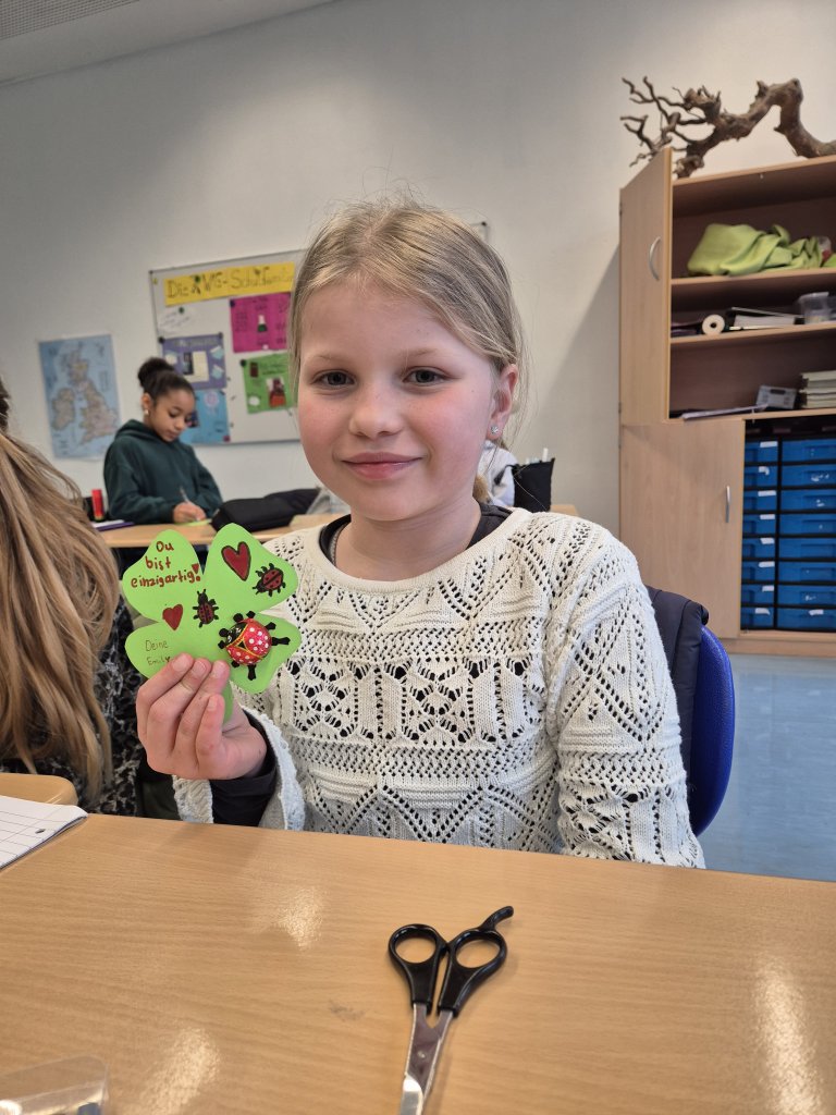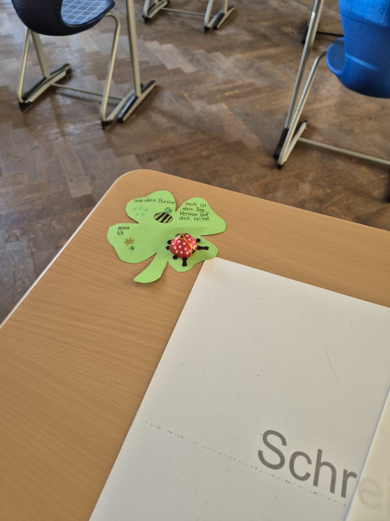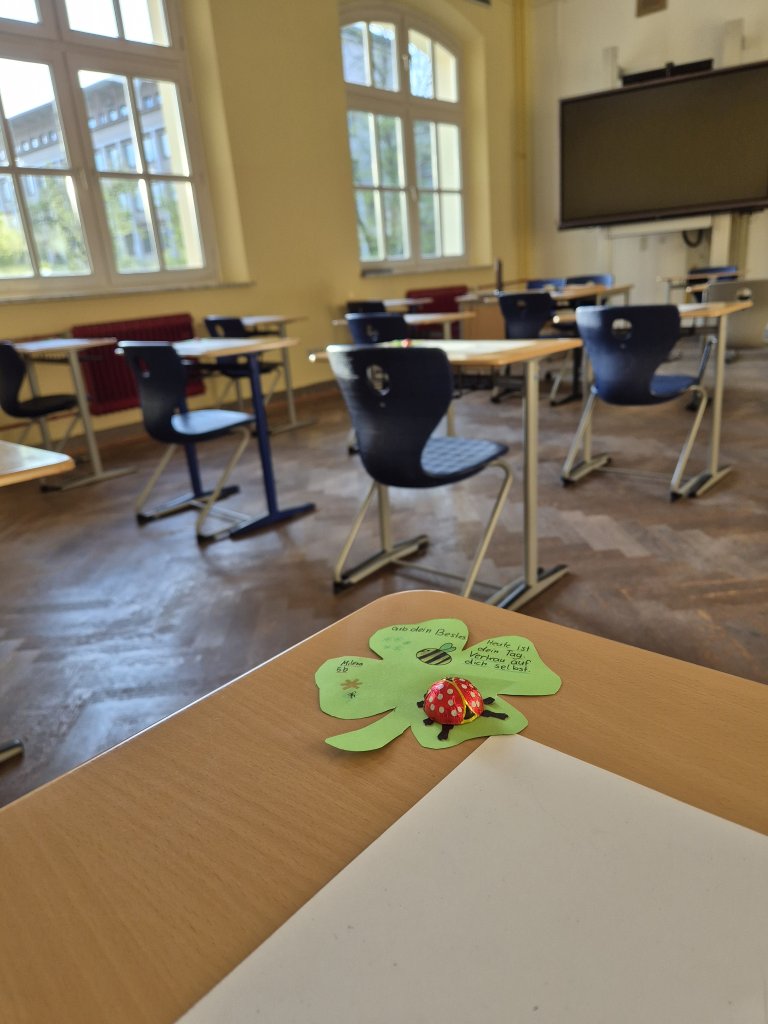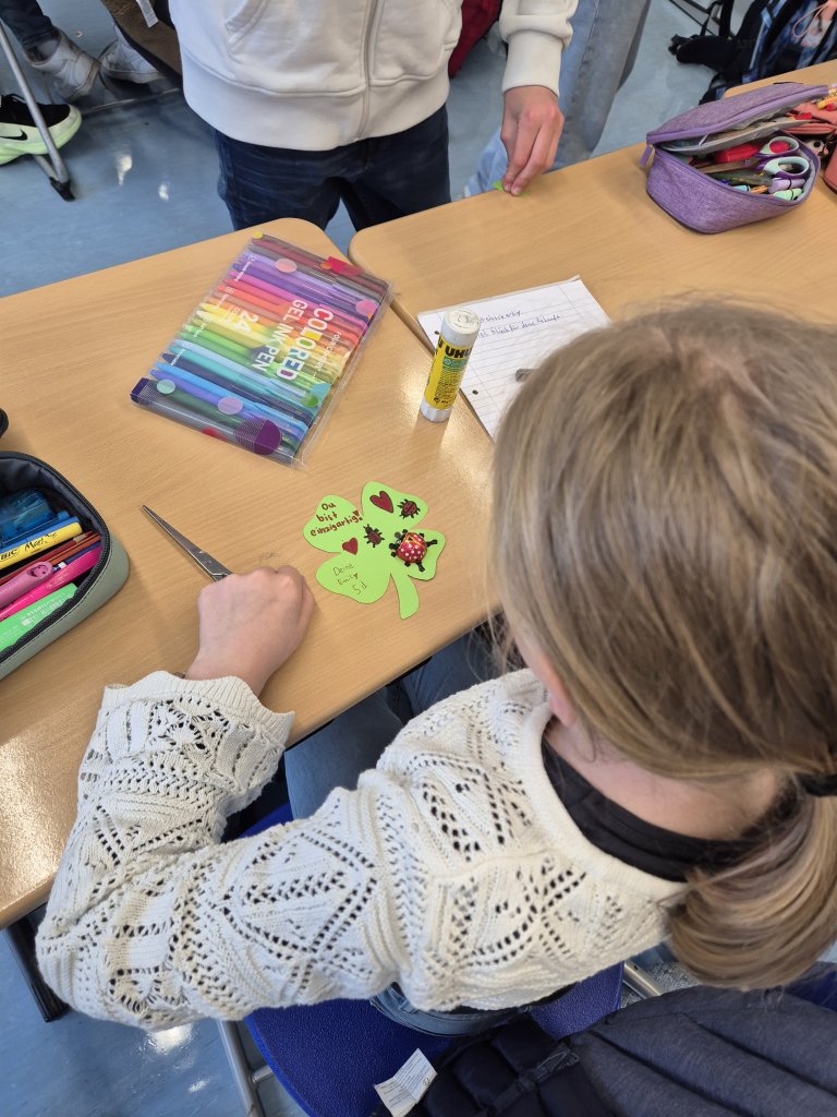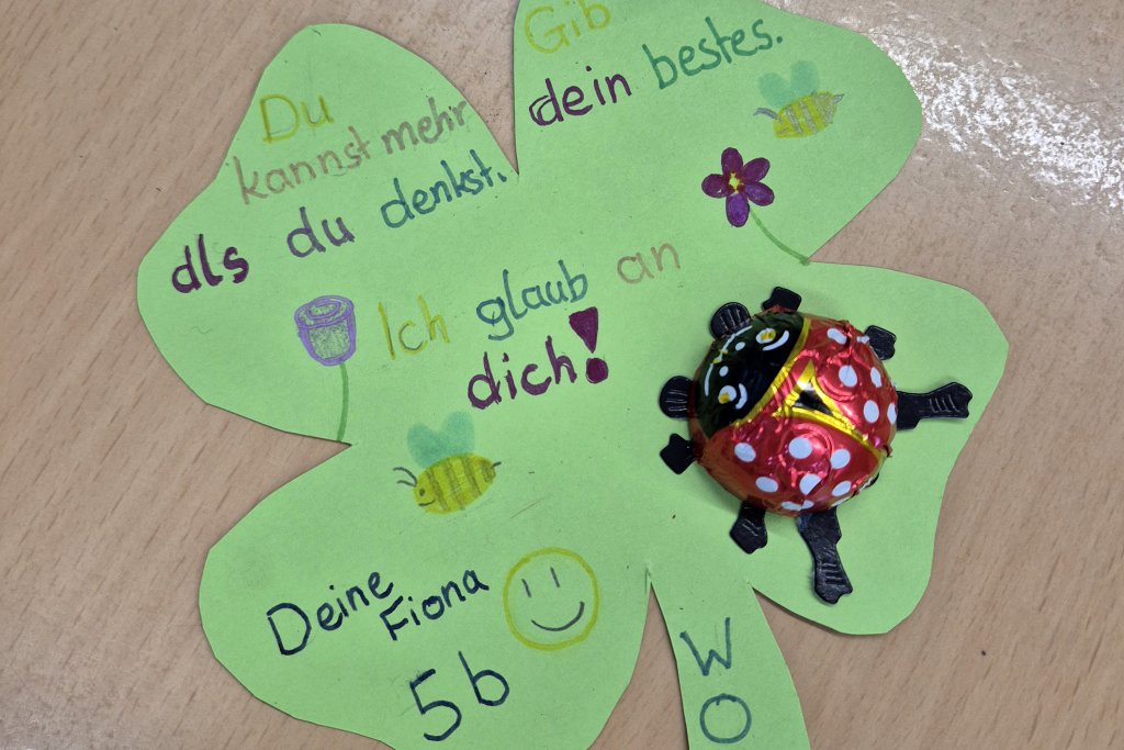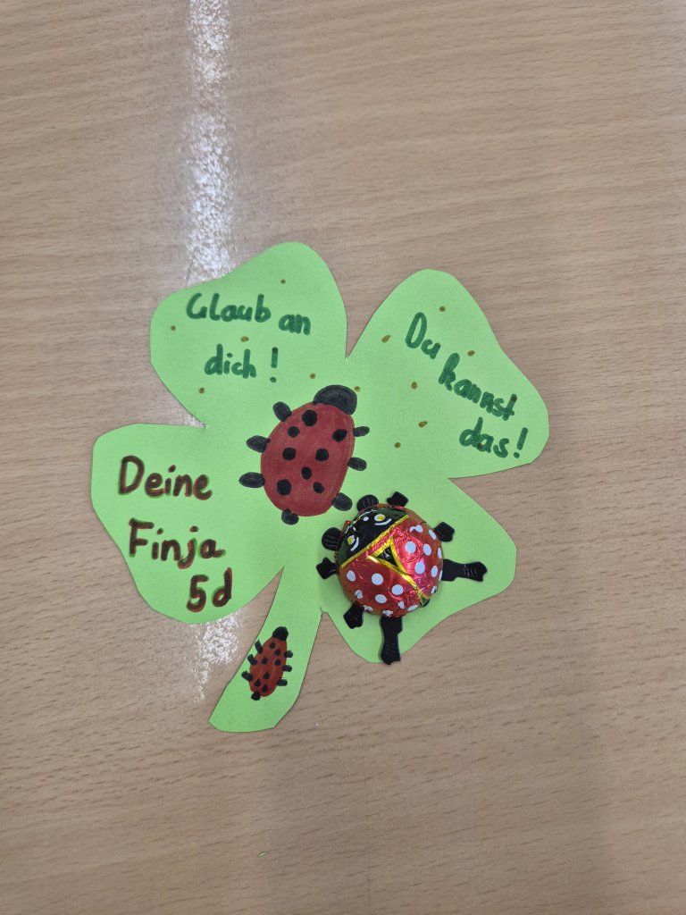 Im Rahmen unserer Ausbildung haben wir als erstes Projekt zusammen mit dem SMV-Werte-Team und den Schülerinnen und Schülern der Ev. Religionsgruppe 5bd von Frau Jurenka besondere Glückwünsche für unsere Abiturienten gebastelt. Diese wurden am heutigen ersten Prüfungstag auf den Tischen in den Prüfungsräumen verteilt. So hat jeder Abiturient einen individuellen Glückwunsch eines Fünftklässlers erhalten.
