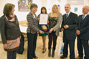 Dass dieses in unserer Schulmensa abgehalten wurde, hat einen guten Grund, denn die offizielle Städtepartnerschaft zwischen Bayreuth und La Spezia wäre ohne das RWG vielleicht gar nicht denkbar: Alles nahm vor fast 30 Jahren mit dem Schulaustausch zwischen dem RWG und der ligurischen Hafenstadt seinen Anfang. 1986 fuhr die erste RWG-Gruppe nach La Spezia, schon damals betreut von Hern Polaczek, der sich freute, bei dem Treffen dabei sein zu können. Schon damals was das I.T.C Fossati Partnerschule, und sie ist es heute noch. Damit dürfte die Schulpartnerschaft eine der ältesten und langlebigsten sein. Deshalb war man beim Mittagessen und beim anschließenden Gang durch die Schule schnell auf vertraulichem Fuße – Schulleiterin Ursula Graf und ihr italienischer Kollege Paolo Manfredini, der zugleich Stadtratsvorsitzender ist und im ligurischen Bezirkstag sitzt, Oberbürgermeisterin Brigitte Merk-Erbe und die Kulturreferentin Patrizia Saccone, Frau Klamt, Frau Saathoff-Stark und Frau Segalla als Lehrerinnen.