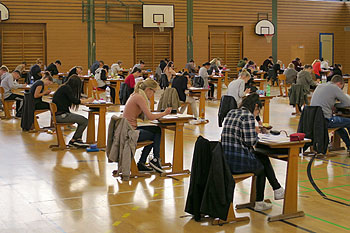 Als Erstes stand das Fach Deutsch an. Schon eine halbe Stunde vorher waren alle da und es herrschte doch etwas Aufregung in der Turnhalle: Die zugelosten Plätze mussten gefunden werden und viele richteten sich den Arbeitsplatz für die erste Prüfung gleich häuslich ein: Literweise Cola gegen den Unterzuckerungsschock beim Lesen der Aufgaben, Vitamine in Form von Orangen, um die Abwehrkräfte des Körpers gegen die Arbeitssperre zu stärken, da und dort eine kleine Süßigkeit der Kursleiter, die ebenfalls nervös auf- und abliefen: Schließlich möchten auch sie, dass ihre Schüler etwas können und die Aufgaben nach all der Arbeit der zwei letzten Jahre machbar sind.