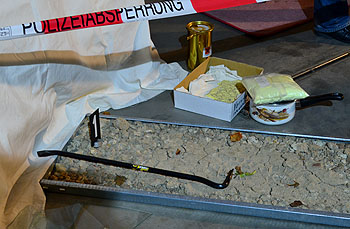 Den praktischen Einsatz der am Vormittag kennengelernten Methoden erfuhren die Schüler dann vor Ort bei der Kriminalpolizei Bayreuth. Das Team um KHK Wölfel machte für unseren Begabtenkurs eine riesengroße Ausnahme und lud zur Tatortbesichtigung ein. In einer Halle war originalgetreu ein Tatort aufgebaut, den es nun spurentechnisch zu untersuchen galt. KHK Wölfel und KHK Kurth zeigten die professionelle Spurensicherung. Dabei geht es ganz schön chemisch zu. Mit Schwefelschmelze werden z.B. Fußeindrücke ausgegossen und Braunstein ist ein geeignetes Pulver zum Sichtbarmachen von Fingerabdrücken. Um das Tatwerkzeug zu identifizieren kommt das Elektronenmikroskop zum Einsatz und der genetische Fingerabdruck ist ein wichtiger Bestandteil der Indizienkette.