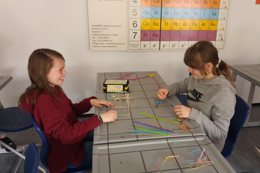 In den ersten Schulstunden des Profilfachs trafen sich alle 20 Schülerinnen und Schüler im Chemiesaal. In 5 Gruppen eingeteilt erhielten sie den Auftrag, einen möglichst hohen, aber auch stabilen Turm aus vorgegebenem Material zu bauen.
