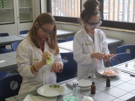 Gegen Ende des Halbjahres wurde schließlich noch verschiedene Versuche mit Backpulver durchgeführt und Slime produziert, wobei nun der Schwerpunkt darauf lag, selbstständig die Geräte aufzubauen, die Materialien bereitzustellen, nach Versuchsanleitung das Experiment durchzuführen und zu protokollieren und schließlich auch den Arbeitsplatz wieder aufzuräumen.