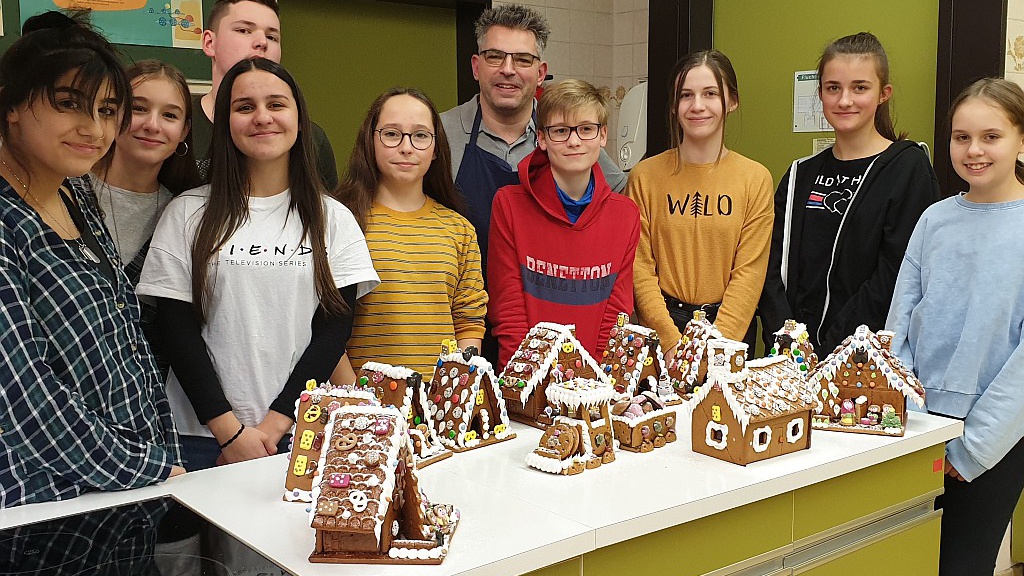 Die Koch-AG der Klasse 8b hat unter Anleitung von Herrn Konditormeister Mario Wachs ein kleines Lebkuchendorf gebaut. Alle hatten viel Freude beim Zusammenbau und bei der Ausgestaltung der kleinen süßen Häuser. Herr Wachs zeigte uns, wie geschmolzene Schokoladenglasur mit etwas Wasser vermischt zum Klebstoff für Lebkuchenteile werden kann. Mit Geduld und in Teamarbeit waren nach…